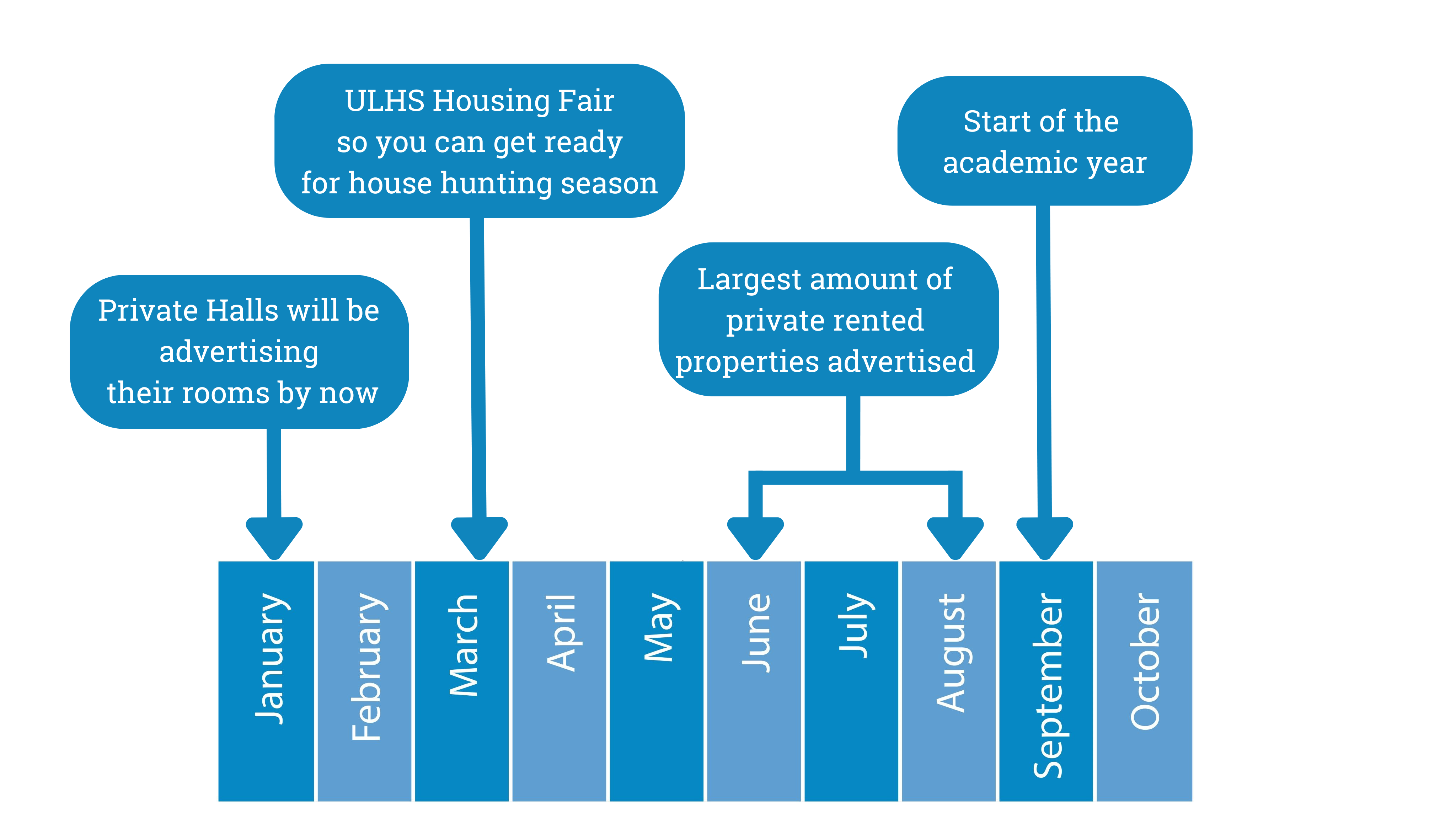 Rooms in private halls of residence are generally advertised earlier in the academic year, sometimes as early as September/October.